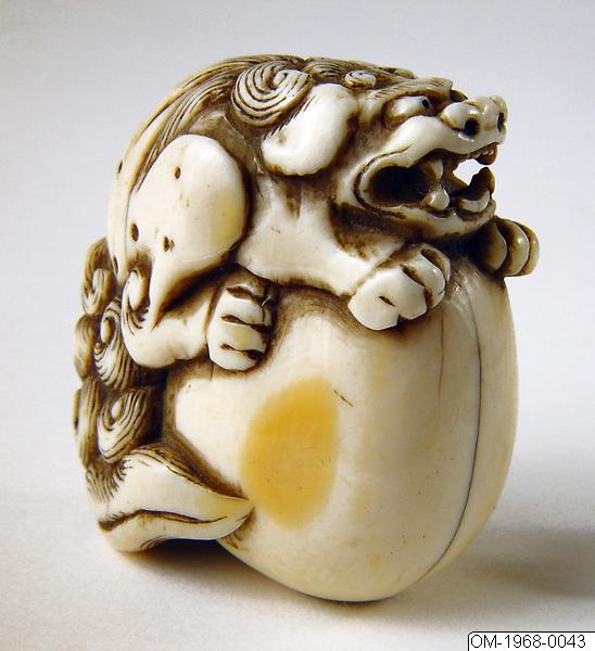 Netsuke of ivory in the shape of a Chinese lion with a ball. The kimono having no pockets, accessories have to be carried somehow. Women could put small objects in their sleeves and sash, whereas men, mainly, would hang their various boxes, pipes and brush cases on a cord at their belt. The portable objects are called sagemono. Accessories became identity-forming status objects and an important part of men´s fashion, a world in miniature with a wealth of subjects. Various kinds of artistically crafted sagemono are known from the 17th century. In addition to boxes for tobacco, cases for personal seals (inro) are one of the best-known types. Literally translated, an inro is a basket (ro) containing a seal (in). Only sealed signatures were legally valid, and so samurai and merchants, for example, needing seal stamps had to carry them in small cases. This was the origin of “seal baskets” (inro), which soon came to be used primarily for carrying medicine. These accessories varied in appearance according to the wearer’s taste and wealth, as well as fashion trends. When Western dress became popular during the Meiji period (1868-1912), there was less need for these portable objects, and they were divided up into their constituent parts (with toggles kept apart) and sold to westerners. (Based on the text for the exhibition catalogue Japan. Artefacts and images tell the story. 2011). The function of the netsuke item is to be a counterweight to the "hanging things" (sagemono) worn with the kimono by the men. Common hanging items were various boxes, for example medicine boxes (inro) and tobacco pouches. Netsuke roughly means "fixed root" and early netsuke (before the late 17th century) were probably natural, unprocessed roots and the like. From the 18th century they were made more representative and often in wood or ivory. Eventually, the artists began to sign their netsuke. (Based on the text for the exhibition Japan. Artefacts and images tell the story. 2011). /PH