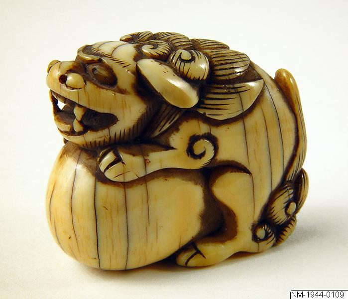 Netsuke av ben, möjligen elfenben, från Japan. Lejon med boll. Kimonon har inga fickor, småsaker kunde läggas i ärmarna och innanför bältet och så kunde man bära olika dosor, pipor och penselfodral på en snodd från bältet. De bärbara sakerna kallas sagemono. Accessoarerna blev särskilt för männen identitetsskapande statusföremål och en viktig del av herrmodet, en egen värld i mindre skala med rika motiv. Olika typer av konstnärligt utformade sagemono är kända fr o m 1600-talet. Förutom tobaksrelaterade dosor är en av de mer kända typerna sigilldosor (inro). Bokstavlig betydelse är en korg (ro) att lägga sigill (in) i. Enligt lag var endast stämplade signaturer giltiga vilket krävde att t ex samurajer och köpmän som hade behov av sigillstämplar fick bära dem med sig i små dosor. Detta var ursprunget till sigilldosor (inro) som snart främst kom att användas för medicinförvaring. Utseendet på accessoarerna varierade efter bärarens smak, ekonomi och modetrender. När västerländsk klädsel med fickor blev populär under Meiji-perioden (1868-1912) minskade behovet av dessa bärbara föremål och de delades ibland upp i sina beståndsdelar (netsuke, s k bältesknappar) för sig och såldes till västerlänningar. (Baserad på text från utställningskatalogen Japan. Föremål och bilder berättar. 2011). Miniatyrskulpturerna, ofta kallade bältesknappar, (netsuke) rymmer en hel värld att utforska. Myter är ett stort motiv. Ofta var designen lyckobringande och inte minst underhållande. Netsuke-föremålets funktion består i att vara en motvikt till de "hängande saker" (sagemono) som bars till kimonon av männen. Vanliga hängande saker var olika dosor, till exempel medicindosor (inro) och tobakspungar. Netsuke betyder ungefär "fästa rot" och tidiga netsuke (före sent 1600-tal) var förmodligen naturliga, obearbetade rötter och liknande. Från 1700-talet gjordes de mer föreställande och ofta i trä eller elfenben. Så småningom började konstnärerna att signera sina netsuke. (Baserad på text från utställningen Japan. Föremål och bilder berättar. 2011)./PH