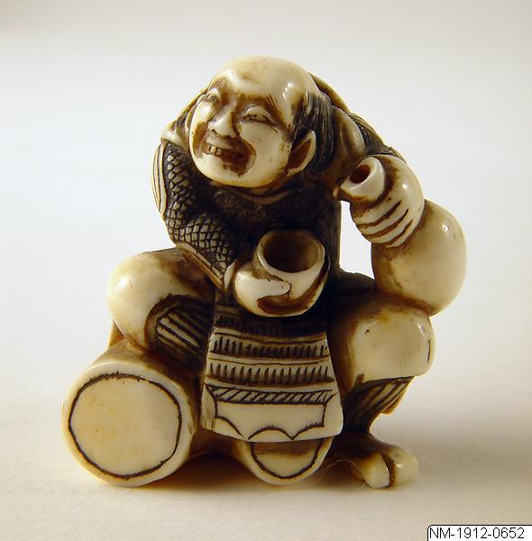 Netsuke depicting a man with a bottle, probably a samurai in armour (?). Ivory. The kimono having no pockets, accessories have to be carried somehow. Women could put small objects in their sleeves and sash, whereas men, mainly, would hang their various boxes, pipes and brush cases on a cord at their belt. The portable objects are called sagemono. Accessories became identity-forming status objects and an important part of men´s fashion, a world in miniature with a wealth of subjects. Various kinds of artistically crafted sagemono are known from the 17th century. In addition to boxes for tobacco, cases for personal seals (inro) are one of the best-known types. Literally translated, an inro is a basket (ro) containing a seal (in). Only sealed signatures were legally valid, and so samurai and merchants, for example, needing seal stamps had to carry them in small cases. This was the origin of “seal baskets” (inro), which soon came to be used primarily for carrying medicine. These accessories varied in appearance according to the wearer’s taste and wealth, as well as fashion trends. When Western dress became popular during the Meiji period (1868-1912), there was less need for these portable objects, and they were divided up into their constituent parts (with toggles kept apart) and sold to westerners. (Based on the text for the exhibition catalogue Japan. Artefacts and images tell the story. 2011). The function of the netsuke item is to be a counterweight to the "hanging things" (sagemono) worn with the kimono by the men. Common hanging items were various boxes, for example medicine boxes (inro) and tobacco pouches. Netsuke roughly means "fixed root" and early netsuke (before the late 17th century) were probably natural, unprocessed roots and the like. From the 18th century they were made more representative and often in wood or ivory. Eventually, the artists began to sign their netsuke. (Based on the text for the exhibition Japan. Artefacts and images tell the story. 2011). /PH