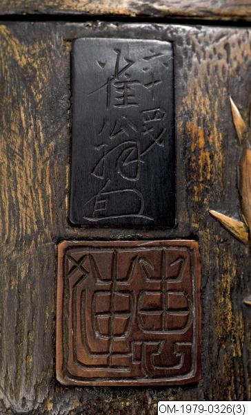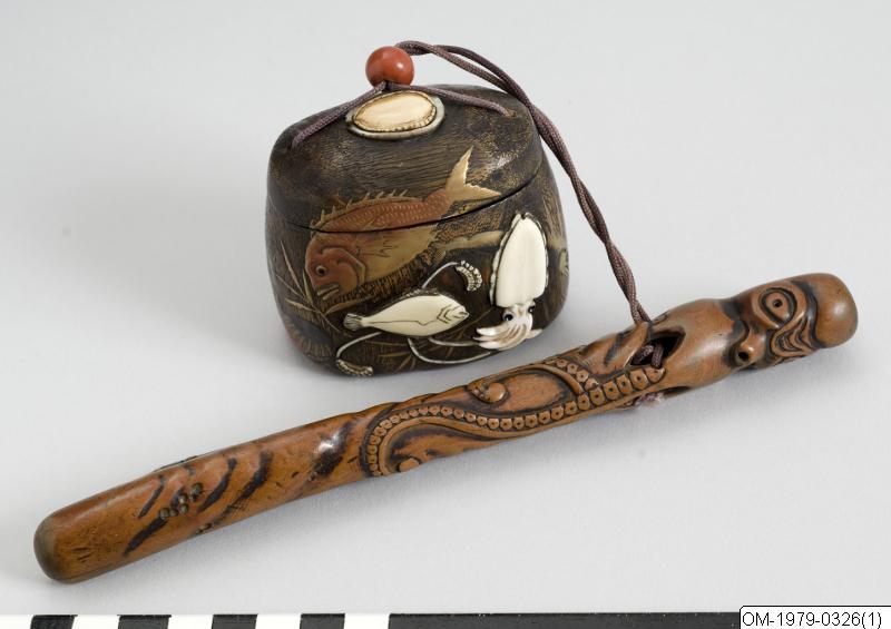 Pipfodral och tobaksask. Trä med guld, grönt och rött lack, beninlägg. Tobaksasken är dekorerad med en tai (havsruda), en ika (tioarmad bläckfisk), en awabi (havsöra) och en flundra. Motivet på baksidan är ett bambuskott. Piphållaren, av typ senryu-zutsu, är gjord av snidat trä och föreställer en bläckfisk (tako). Signerad: Jakuo. 1800-tal. Lack: teknik och funktion Den japanska lacken kommer från lackträdet (Rhus verniciflua/vernicifera) som är släkt med mango och cashewnöt i familjen sumakväxter. Det finns flera besläktade lackträd som kan ge lack. Trädet tappas på sin sav ungefär som när man tappar gummi. Efter tappning dör trädet. Saven filtreras och är i sin flytande form eksemframkallande. Den är nästan ofärgad. Genom pigment färgas lacken, t ex svart (med järnoxid) eller röd (från kvicksilver). Lackens funktionella betydelse ligger i att den skyddar underlaget. Vanliga underlag är trä, men även metall, textil, papper och keramik. Lackeringen består ofta av ett 50-tal faser och börjar med grundning, en blandning av lack, bränt lerpulver och stenpulver. Sedan följer slipning. Själva lackeringen sker ofta i flera lager. Varje lager behöver härda i ett dammfritt skåp med ca 80% luftfuktighet. Polering är också ett viktigt moment. Tidsåtgången för ett exklusivt lackföremål kan vara upp till tio år. Vanliga dekorationstekniker är inlägg av bl a pärlemor samt pulveriserade metaller (maki-e). Lacken användes på t ex rustningar och under andra världskriget som rostförebyggare på vapen. Guldlack används även vid lagning av keramikföremål, där det icke-perfekta sätts i fokus genom lacket som en medveten del i estetiken. Hantverk: exemplet lacktillverkning De största lackproducerande områdena idag är Tokyo (Edo-lack), Kyoto (Kyo-lack) och Kanazawa (Kaga-lack). Andra viktiga platser för lacktillverkning med lång historia är Wajima, Takayama och Takamatsu. Lackarbeten har använts i Japan som konstföremål och vardagsföremål åtminstone sedan mitten av Jomon-perioden (ca 10500–300 f v t). Nya fynd kan troligen dateras till ca 7000 år f v t. Omkring 586 e v t startade en lackavdelning inom finansministeriet för att effektivt kunna organisera lackproduktionen. Buddismen kom till landet under samma tid och man började göra religiöst relaterade föremål som skulpturer och tempelinredningar. Användning av pulvriserade metaller är belagd från 700-talet, bl a i form av ”strödd bild” (maki-e) som anses unikt japansk. I Heian-periodens (794–1185) mest berömda berättelse, Genji monogatari, nämns rikt dekorerad lackinredning och lackföremål. Under Edo-perioden räknades lackträdet som ett av de ”fyra viktiga träden” tillsammans med tebusken, mullbärsträdet som man gör papper av (Broussonetia papyrifera) och mullbärsträdet som man matar silkeslarver med (Morus alba). Lackråvaran användes t ex som skattebetalning. Under Edo-periodens mitt började även förmögna handelsmän beställa exklusiva lacker med guld och pärlemorinläggningar. Lackföremålens stora betydelse i Japan jämförs med bruket av porslin i Kina. När européerna kom till Japan i mitten av 1500-talet blev de fascinerade av lackerna. Lacker var hett eftertraktade och gick på export till Europa, särskilt den typ som kallas namban-lack, som ofta har pärlemorinläggningar. Européerna försökte också att imitera den japanska lacken utan större framgång (”japanning”). Under 1900-talet har flera åtgärder vidtagits för att både bevara och kreativt utveckla lackkonsten. (Baserad på text från utställningskatalogen Japan. Föremål och bilder berättar. 2011). /PH