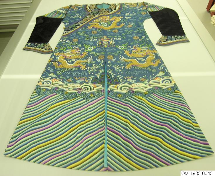 Material: Kesi-vävt siden med mångfärgat mönster på gråblå botten i dräkten och mörklila botten på manschetter och halsinfällning. Nederärmar i mörklila satin. Kantband i brokad. Ljusblått sidenfoder.