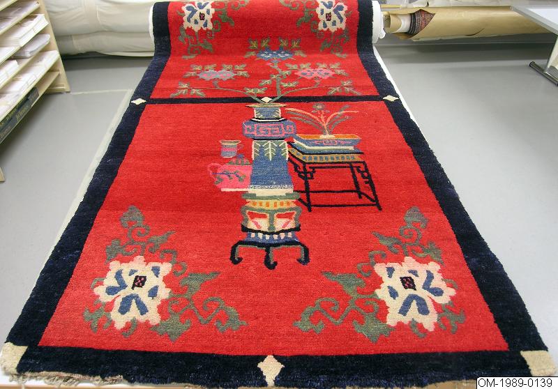 • Dörrmatta med antikvitetsmönster samt stiliserade blommor mot röd botten.