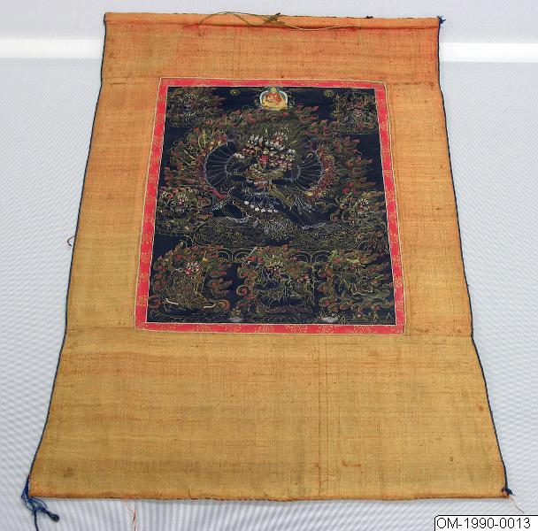 Thanka. Gouache på duk. Monterad med ram av orange, grovt siden. Målningen visar Vairabhairava - en aspekt av dharmapala Yamantaka (en av Manjusri's manifestationer), omgiven av de övriga sju dharmapalasi deras tantriska aspekt. Alla dharmapalas stående i pratyalidhasana. Över Vairabhairava lama (oid.) i dhyanasana, omgiven av sol och måne. Målad med ljusa konturer (rött, gult, blått) mot svart svart fond. Enbart i måleriet av lamaen konturerna utfyllda med färg. Kring målningen smal bård med blommotiv i gult mor röd fond. Stilen visar starkt inflytande från Kina.