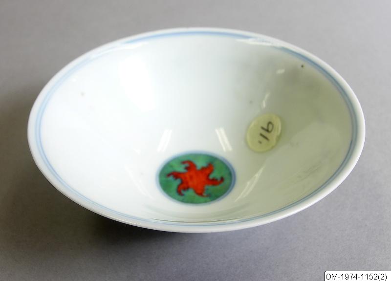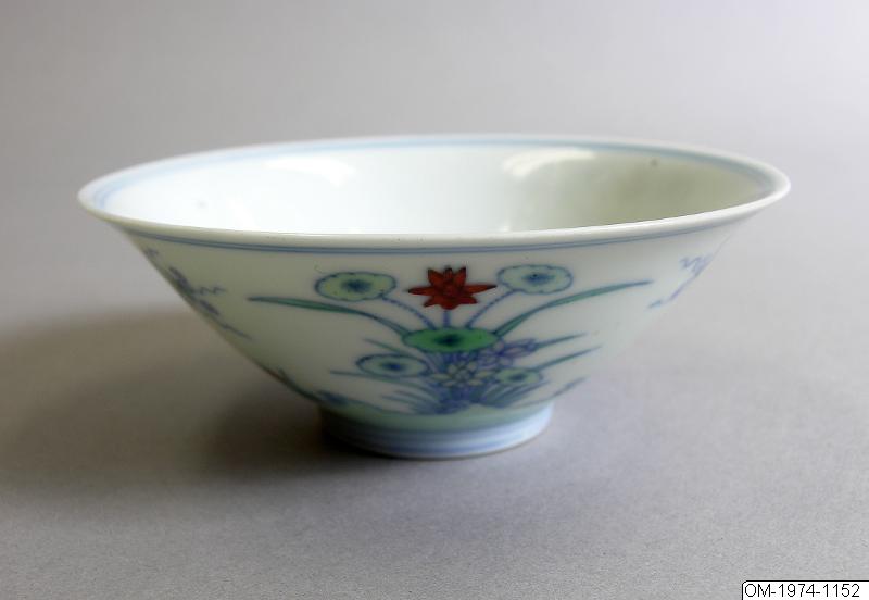 Enligt katalogkort: Liten skål i öppen klockform. Dekorerad i Duocai med lotus mm. Material: tunt porslin med svagt blåtonad glasyr. Tillverkningsort: Jingdezhen. Närmare tidsbestämning: Märke Chenghua, tid Yongzheng