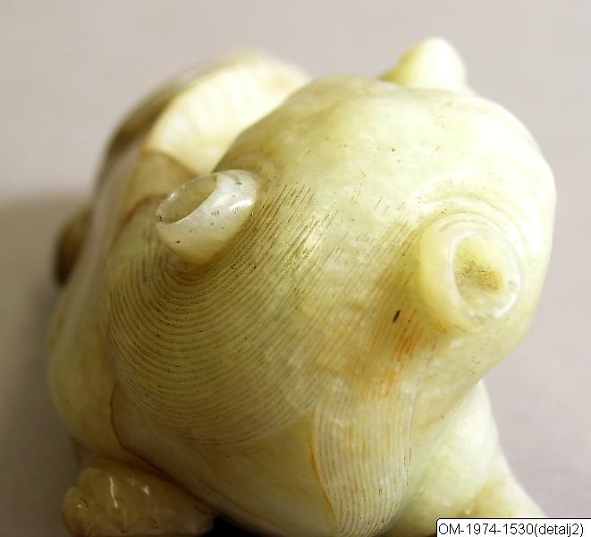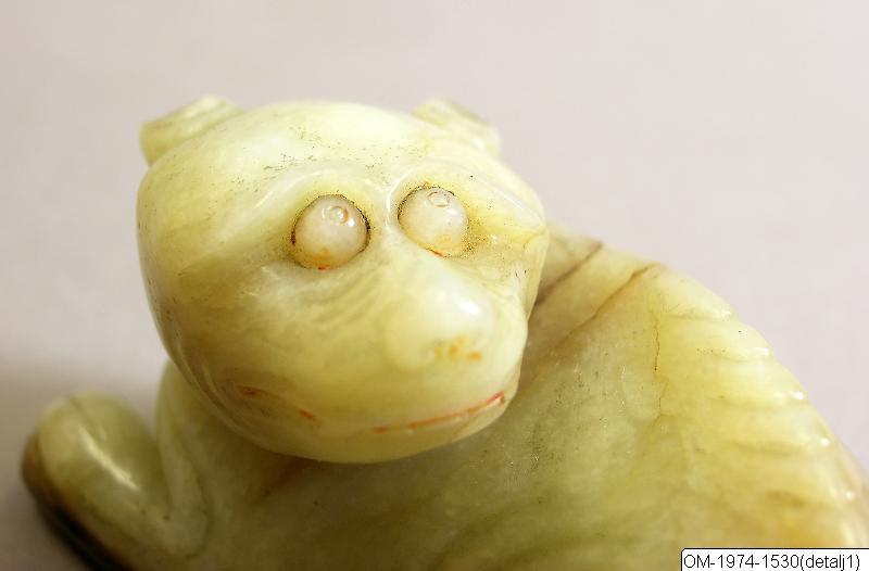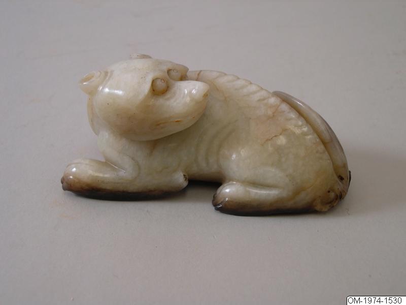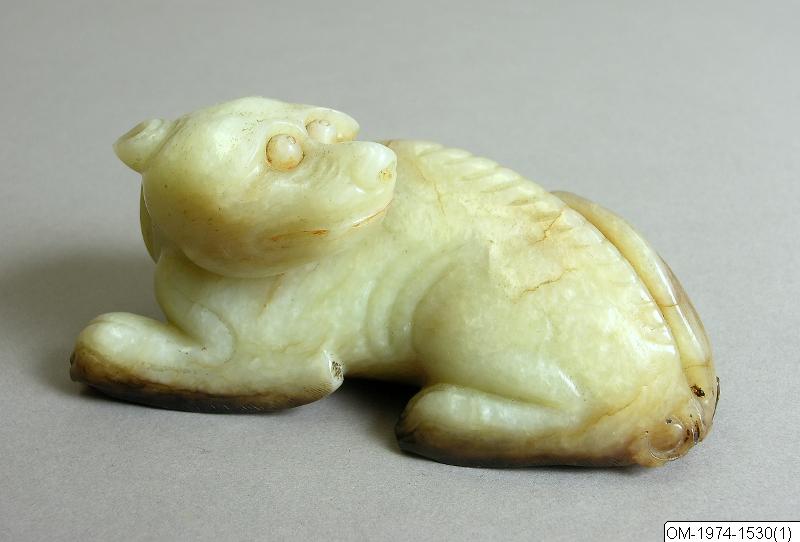 Figurin av jade föreställande hundliknande djur Sannolikt Ming (1368-1644). Gustav VI Adolfs samling.OM-1530
