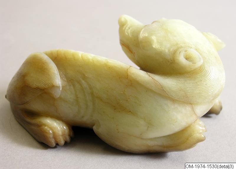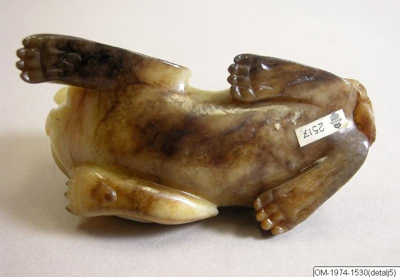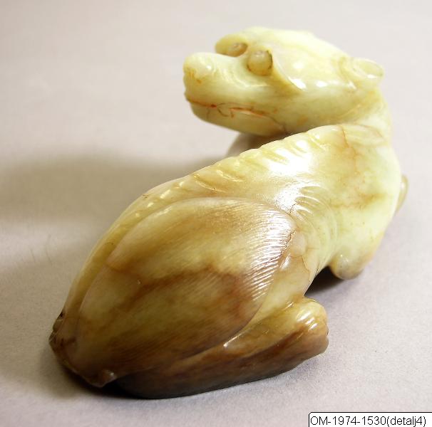 Enligt katalogkort: Liggande hunddjur med yvig svans som vrider huvudet bakåt. Material: Grågrön jade med bruna ådringar. Närmare tidsbestämning: Wei.