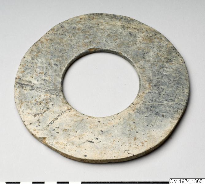 Enligt katalogkort: Jade-bi, något ojämn i kanten. Ena sidan till omkr. hälften täckt av kalkinkrustering. Material: Flammig, grågrön jade. Närmare tidsbestämning: Zhou-tiden.