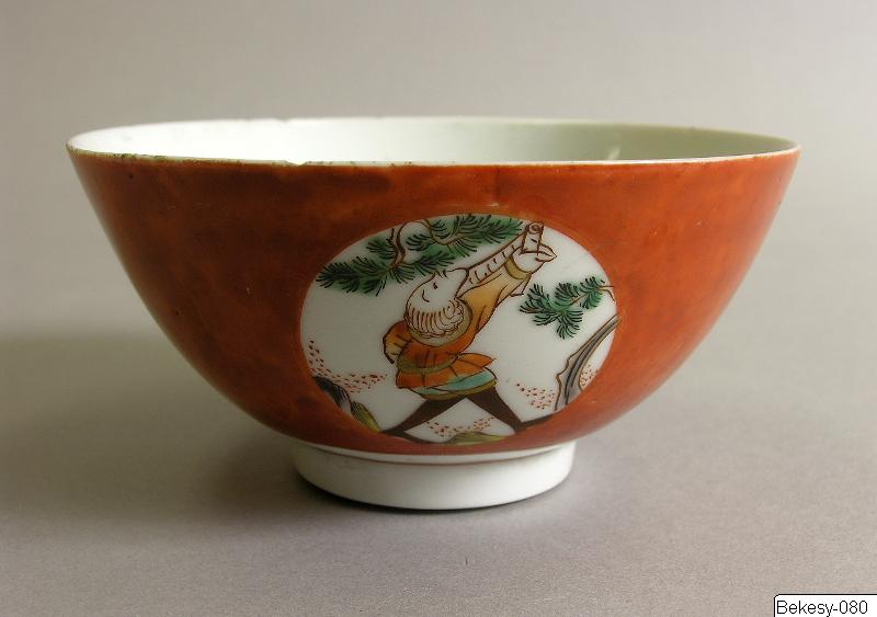 Bowl with spreading, rounded sides on low straight foot. Porcelain decorated on the outside with three medallions showing Westerners (Dutchmen) in gold, iron-red, black, brown, green, yellow, turquois...