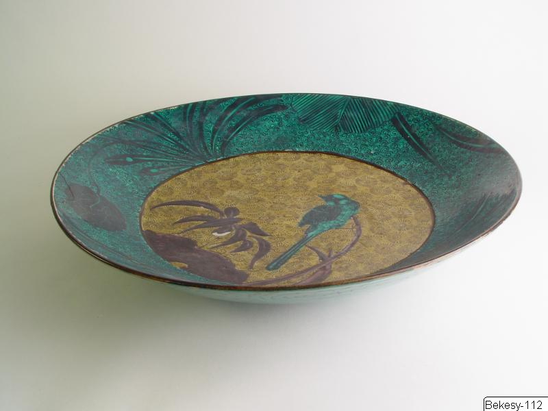 Dish. Porcelain decorated with bird on bamboo twig, leafscroll and spiral pattern in turquoise, aubergine and yellow. Kutani-ware. Edo period. Japan. D: 35 cm