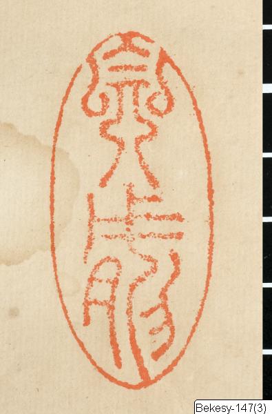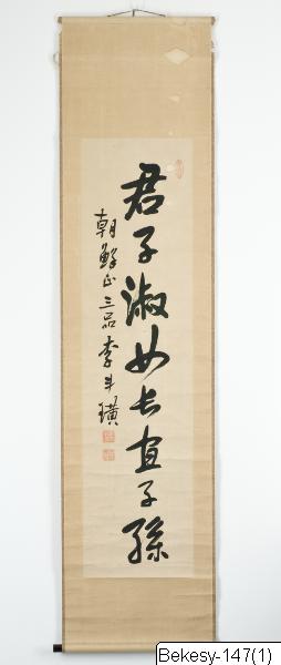 This calligraphy written in ink on paper was mounted on a hanging scroll. The calligraphy consists of eight Chinese characters written in one column in semi-cursive script (Korean: haengseo) expresses the wish for a respected family and a continuous lineage (君子淑女长直子孙). This calligraphy was probably produced on occasion of a wedding. The inscription to the left states that this calligraphy was written by Lee Du-hwang (1858-1916), an official of the 3rd degree of Joseon (1392-1910) ( 朝鲜正三品 李斗璜). Two square seals follow the inscription: the first one is an intaglio seal and reads "seal of Lee Du-hwang" (李斗璜印), the second one is a relief seal containing the artist's sobriquet, "Seorak" (雪嶽??). A round relief seal can be found in the right upper corner of the hanging scroll.