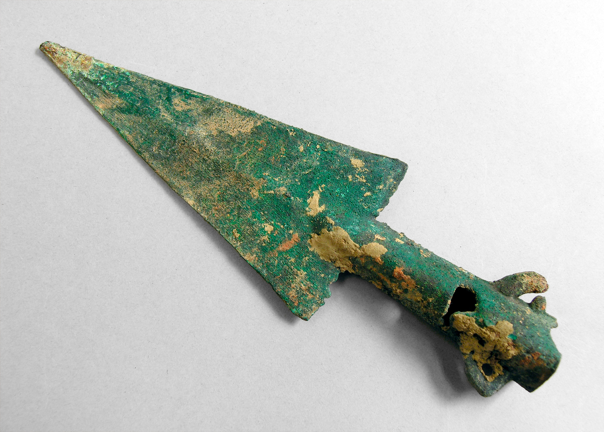 K-11276-088 Socketed spear-head with triangular blade. Loops at the side of the socket for attachment. Weight:? L.: 16 cm. Shang, Anyang period. Purchased by O. Karlbeck from farmers in the neighbour...