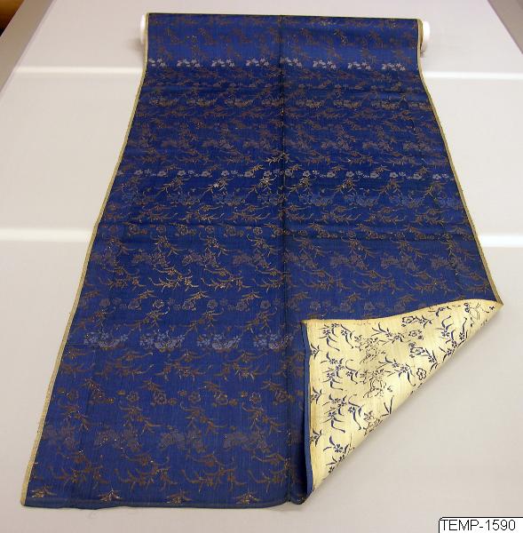 • Textil av siden och någon typ av lan, förmodligen papperslan. Blå silkebotten med invävda förgyllda lan. På textilens baksida skiner lanen vita.