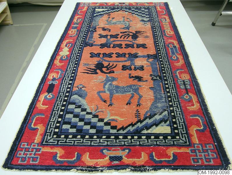 Yllematta med dekor av hjortar och tranor samt fladdermöss under wutongträd. Mönstret i olika blå nyanser, rött och vitt mot roströd botten. Mittfältet kantat av meanderbård i blått och vitt. Bred ytterbård mot röd botten med mönster av taoistiska lyckosymboler samt i hörnen knutmotiv. Längs långsidorna blå kantar. Baotou, Suiyuan.