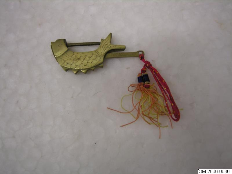 풍요와 다산을 상징하는 물고기 모양으로 만든 황동 재질의 자물쇠이다. 몸통을 두 부분으로 따로 주조하여 땜납으로 부착했다. 두 부분을 더 견고하게 고정하기 위해 박은 못은 물고기의 눈 역할을 한다. 비늘과 지느러미와 같은 물고기의 세부 묘사는 음각으로 처리했다. 열쇠를 물고기 꼬리 끝부분에 밀어 넣으면 빗장이 빠지며 자물쇠가 열리는 구조이다. 20세기에 만...