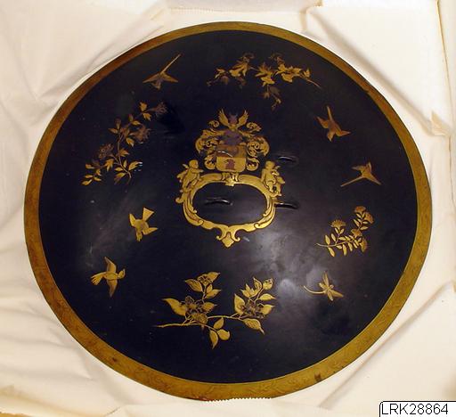 Rund sköld lackerad i svart med guldmotiv, fåglar, blommor och trollslända. Mitt på sköldens framsida finns det coyetska familjevapnet avbildat i guldlack. Baksida i "päronskalsmönster" (nashiji). På baksidan av skölden finns en lapp med handskriven påskrift: