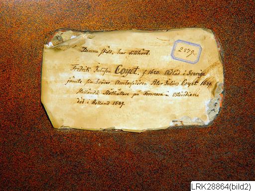 "Denna sköld har tillhört Fredrik Juliison Coyet f. 1620 adlad i Sverige jämte sin broder ambassadören Peter Julius Coyet 1649. Holländsk ståthållare på Formosa i Ostindien död i Holland 1689"