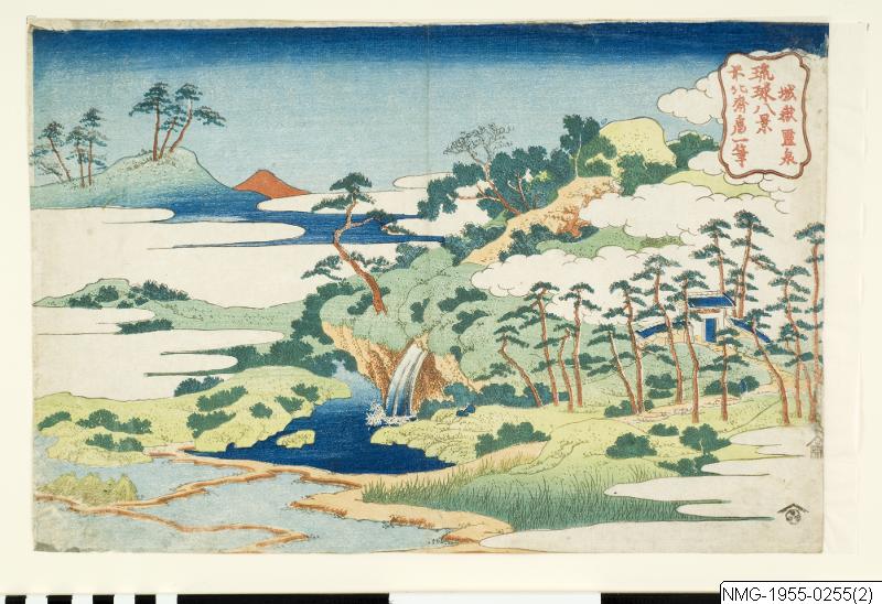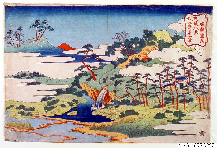 Träsnitt av Katsushika Hokusai. Enligt Publicerat: ”Den heliga källan Jogaku. Ur en serie utsikter från Lu Chu-öarna. (...)”, dvs Ryukyu-öarna på japanska. Ca 1832. /PH