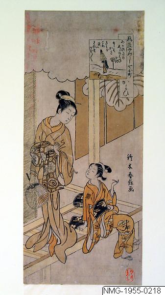 Två unga kvinnor vid en veranda, poem högst upp till höger. Ono no Komachi tillbakavisar en kärleksförklaring från Shii no Shosho, ur serien Sju populära aspekter på Komachi (titel Kayoi komachi, ur Furyu yatsushi nana komachi). Träsnitt av Suzuki Harunobu (ca 1725-1770). Ca 1766-1767. Se https://collections.mfa.org/objects/232648
