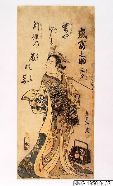 Skådespelaren Arashi Taminosuke som kurtisanen Sanseki enligt kataloguppgift. Konstnär: Torii Kiyohiro, aktiv ca 1750-1770-tal. Förläggare Yamamoto Han, Maruta Kohei Utställningstext: Skådespelaren Arashi Taminosuke som kurtisanen Sanseki The actor Arashi Taminosuke as the courtesan Sanseki Torii Kiyohiro (1708-1776) Träsnitt. Woodblock print Kabuki-teatern Kabuki-teatern är en av de mest kända teaterformerna i Japan och har ursprung i tidigt 1600-tal. Publiken bestod främst av de välbärgade stadsborna. Under tiden mellan 1603 och 1629 stod främst kvinnor på scenen (onna kabuki). Pionjären Izumo no Okuni framförde i Kyoto och Edo ”excentriska danser” (kabuki odori), ofta i manskläder och med utländska inslag som halsband med kors. Från 1629 förbjöds kvinnor att agera och istället var det främst unga män eller pojkar som uppträdde (wakashu kabuki). Både kvinnorna och de unga männen var ofta involverade i prostitution. Bland annat p g a de många striderna om dem tilläts från 1652 enbart vuxna män med rakad främre del av hjässan att uppträda. Berömda spelstilar för mansroller är en ”överdriven”, kraftfull spelstil (aragoto) och en mjukare, mer realistisk stil (wagoto), ursprungligen från Kansai, d v s området kring Osaka. De män som specialiserade sig på kvinnoroller kallas onnagata (oyama), de män som spelar män tachiyuki eller tateyaku. Dockteatern (bunraku eller joruri) och kabuki-teatern påverkade varandra ömsesidigt från sent 1600-tal. En av Japans mest kända pjäsförfattare, Chikamatsu Monzaemon (1653–1724) skrev pjäser för både dockteatern och kabuki. 2005 utnämnde UNESCO kabuki till ”Masterpiece of Oral and Intangible Heritage of Humanity” inom kategorin “Intangible Cultural Heritage”. Kabuki är bland mycket annat känd för sin tidigt relativt tekniskt avancerade scenteknik. Bland annat kan nämnas maskineri som gjorde det möjligt för aktören att snabbt dyka upp på olika ställen och vridscenen (mawaributai) som uppfanns 1758 och som gjorde snabba scenbyten möjliga. Själva föreställningarna var på dagtid eller så länge det fanns tillräckligt med ljus. Redan före kl 7 på morgon var en vanlig starttid, vilket gjorde att en del i publiken övernattade i närheten för att kunna få bra sittplatser. Priset på biljetter varierade kraftigt och berodde på skådespelarnas popularitet och en utbredd stjärnkult. På kabuki-scenerna syntes förr både dagsaktuella och historiska ämnen. För att undgå censuren förkläddes samtida dramer med samurajroller till historisk tid eller ”fiktiviserades” (personerna gavs t ex andra namn än det verkliga, även om betraktaren förstod vem som avsågs). Ett exempel på det är en välkänd kabuki-pjäs, Kanadehon Chushingura, ibland kallad ”De 47 herrelösa samurajerna (ronin”). Chushingura är fortfarande tema för årliga TV-produktioner och filmer. Den baseras på en verklig händelse från omkring år 1700 och förlades till tidig Muromachi-period (1392–1573) för att undgå shogunatets censur. Inte sällan fick teatrar stängas efter censur och antalet teater-byggnader kontrollerades. Kabuki-dramerna var en kommenterande observatör av det samtida nöjeslivet, men även en kritiker av det pågående militära styret. (Baserad på text från utställningskatalogen Japan. Föremål och bilder berättar. 2011, s 55, 62). /PH