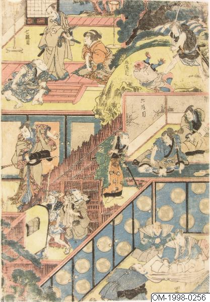 Träsnitt av Utagawa Toyokuni I. Del av triptyk som visar kända kabuki-skådespelare i olika scener i dramat Chushingura om de 47 lojala herrelösa samurajerna. Mitten av 1810-talet. Hör ihop med OM-1998-0257.