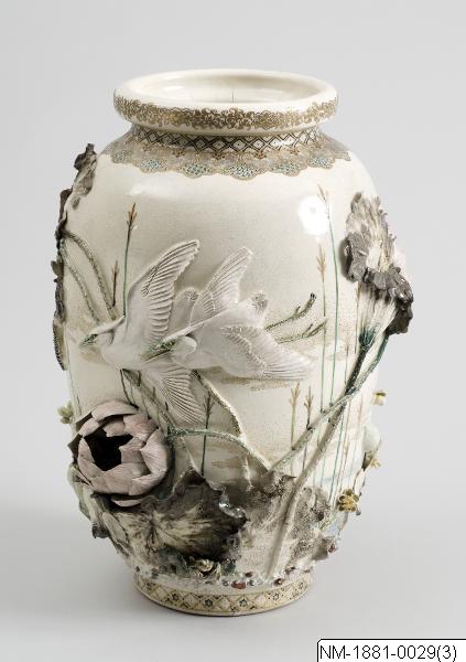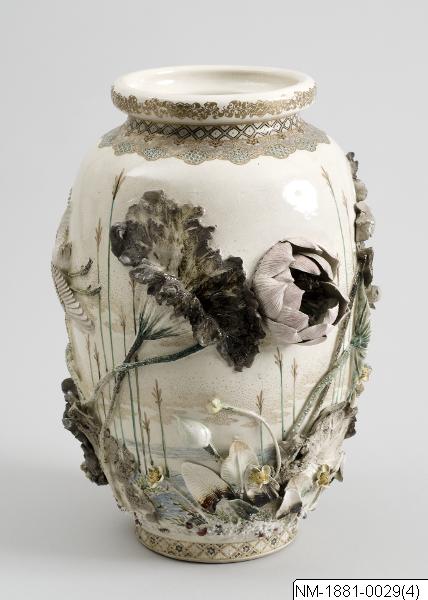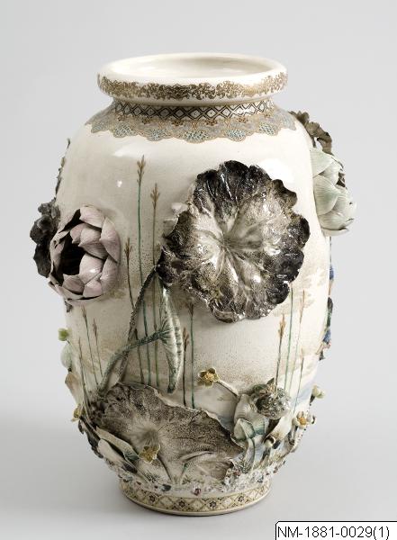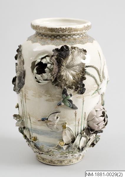 Formgivare och tillverkare: Miyagawa Kozan (1842-1916) Vas med skulptural och mycket detaljrik dekor av ”vattenliv” (grodor, hägrar, kungsfiskare, lotus mm). Högkvalitativ Satsuma-vara, tillverkad av väklände Miyagawa Kozan (1842-1916). Enligt information hemförd med skeppet Vega från Japan på Adolf Erik Nordenskiölds resa 1878-1880. Par med NM-1881-0030.
