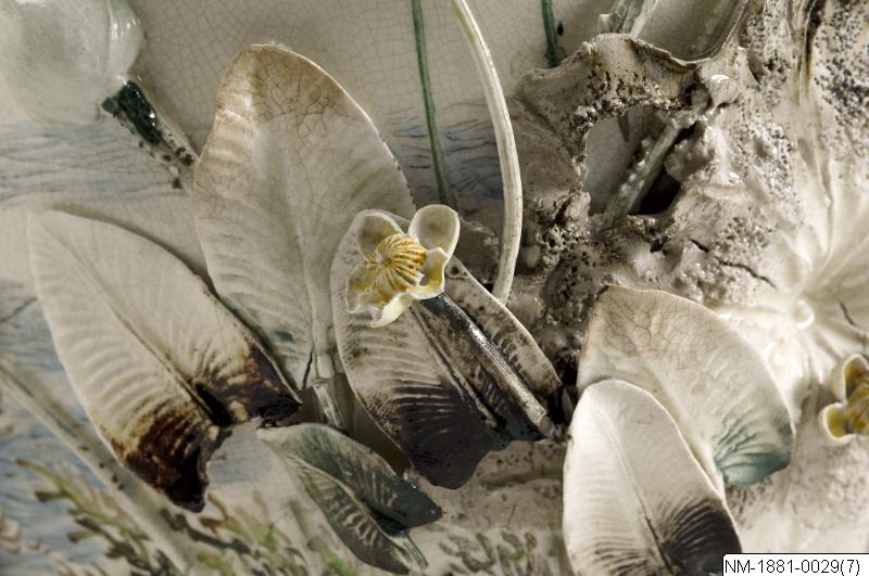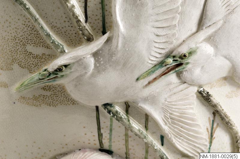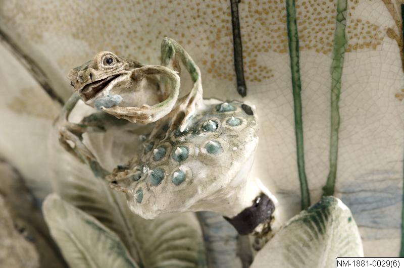 Vas med skulptural och mycket detaljrik dekor av ”vattenliv” (grodor, hägrar, kungsfiskare, lotus mm). Satsuma-vara, sannolikt tillverkad av Miyagawa Kozan/Makuzu Kōzan (1842-1916). Se http://www.jameelcentre.ashmolean.org/collection/4/867/872. Han tillverkade keramik för den västerländska marknanden med hög teknisk briljans och ofta ett speciellt skulpturalt uttryck, även om han arbetade i flera stilar. Han vann många priser både i Japan och utomlands och var en av de mest framstående hantverkarna på sin tid. Enligt information hemförd med skeppet Vega från Japan på A E Nordenskiölds resa 1878-1880. Par med NM-1881-0030. Bortsett från den modest utformade mynningen och basen ger urnorna en skulptural upplevelse av detaljer med motivet vattenliv. (Baserad på text från utställningskatalogen Japan. Föremål och bilder berättar. 2011). /PH