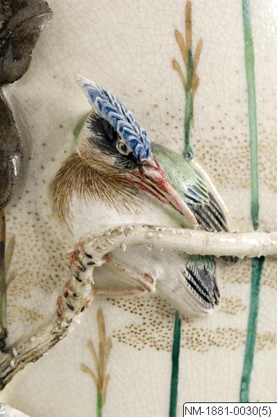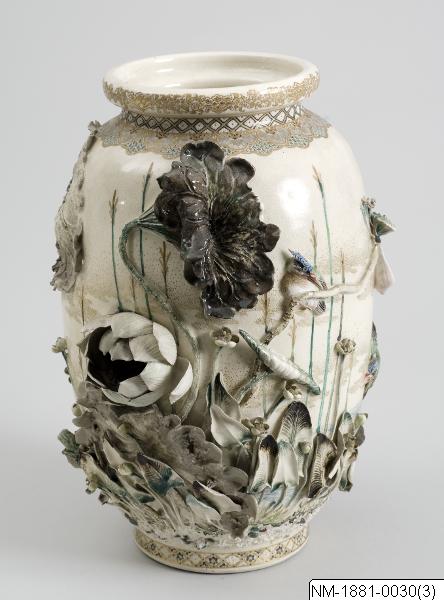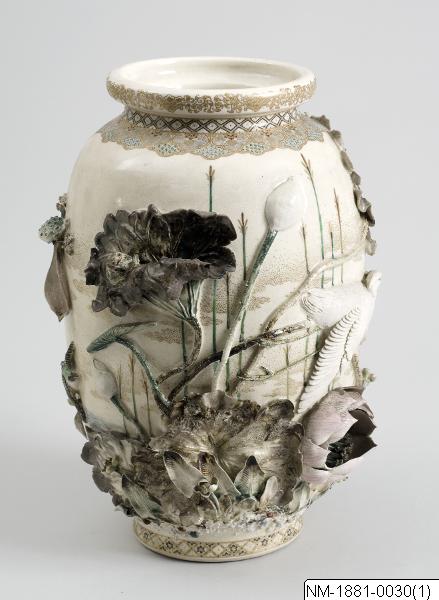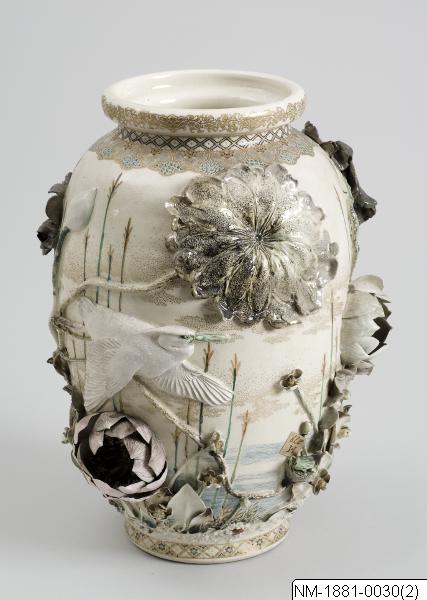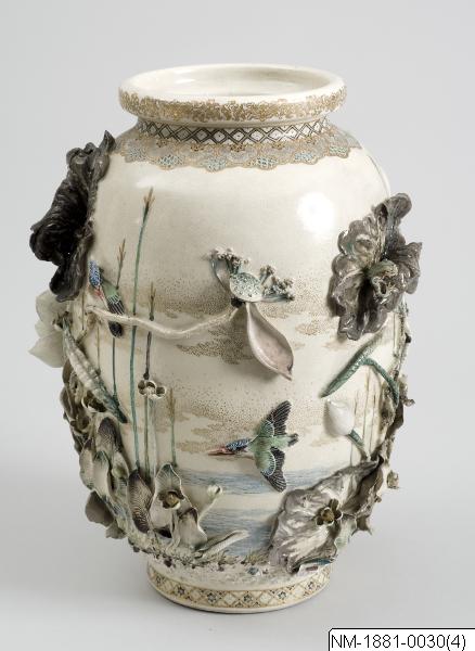 Designer and maker: Miyagawa Kozan (1842-1916) Vase with sculptural and very minute detailed decoration of ´water life´ (frogs, herons, kingfisher, lotus flower etc). Satsuma ware of high quality, designed by famous Mr Miyagawa Kozan (1842-1916). According to the inventoires brought to Sweden in connection to Mr Adolf Erik Nordenskiöld´s travel 1878-1880. Pair with NM-1881-0029. Based on the text in the exhibtion catalogue Japan: Artefacts and images tell the story. 2011. /PH