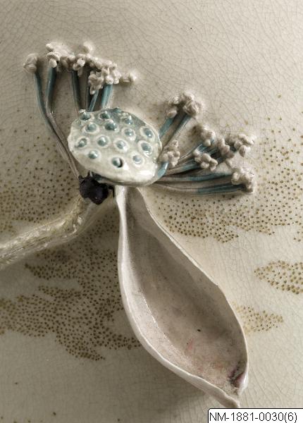 Vas av Satsuma-vara med skulptural och mycket detaljrik dekor av ”vattenliv” (grodor, hägrar, kungsfiskare, lotus mm). Sannolikt tillverkad av Miyagawa Kozan/Makuzu Kōzan (1842-1916). Se http://www.jameelcentre.ashmolean.org/collection/4/867/872. Han tillverkade keramik för den västerländska marknanden med hög teknisk briljans och ofta ett speciellt skulpturalt uttryck, även om han arbetade i flera stilar. Han vann många priser både i Japan och utomlands och var en av de mest framstående hantverkarna på sin tid. Enligt information hemförd med skeppet Vega från Japan på A E Nordenskiölds resa 1878-1880. Par med NM-1881-0029. Bortsett från den modest utformade mynningen och basen ger urnorna en skulptural upplevelse av detaljer med motivet vattenliv. (Baserad på text från utställningskatalogen Japan. Föremål och bilder berättar. 2011). /PH/PH