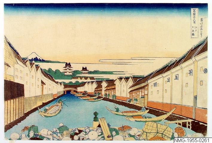 Enligt Publicerat: ”Fuji reser sig över förgrundens varumagasin i Yedo. (No. 41). Fuji appearing over the roofs of warehouses along the banks of a canal. In the foreground the Nihon Bridge, Yedo. Signature: Zen Hokusai I-itsu fude. Förläggare: Nishimura.” 1830-1831. Nihonbashi Bridge in Edo (Edo Nihon-bashi), from the series Thirty-six Views of Mount Fuji (Fugaku sanjûrokkei)