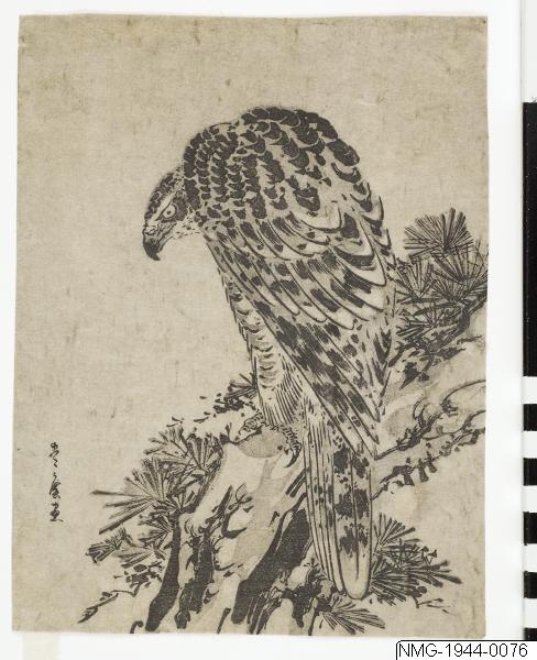 • Örn på tallgren. Svartvitt träsnitt av Utagawa Toyohiro. Utställd på Japanska utställningen i Stockholm 1911.