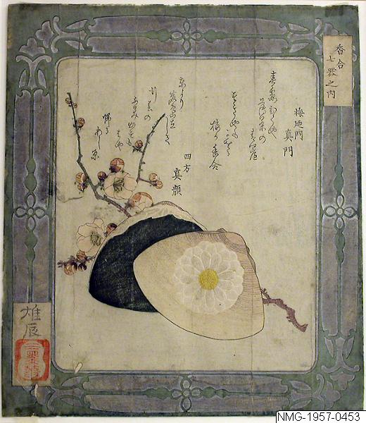 Surimono-träsnitt av Suibokuan Yushin. Surimono med snäckor och plommonblom, illustration till poem av Umenomon Makado och Yomo no Magao, från serien En serie av rökelsespel. 1820-talet. Se https://allenartcollection.oberlin.edu/objects/521/surimono-with-clamshells-and-plum-blossoms-illustrating-poe