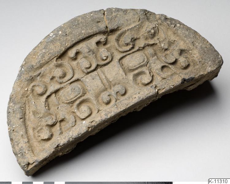 Halvcirkelformat ändstycke till tagtegel med t’ao t’ieh-maskL. 21,5 cmBr. 10,5 cm