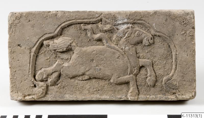 Murtegel med hästmotiv. Mycket lika K-11312 med undantag av att den har en skada på framsidans kantL. 32 cmBr. 15,3 cmTjockl. 5 cm