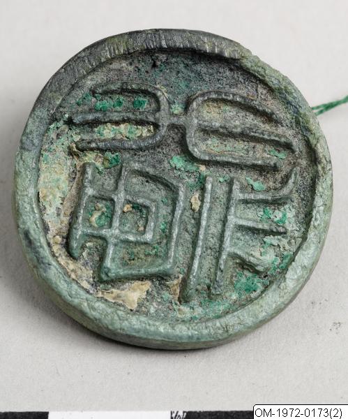 Det här sigillet består av en rund bottenplatta och ett smalt vinklat handtag som också fungerar som snörögla. Bottenplattans yta bär dekor i lågrelief runt handtaget. Legend i relief i sigillskrift föreställer tecknet 標, som betyder ”registrera” eller ”märka”. (Jämför sigill med inköpsnummer OM-1972-0160.)Ursprunget till de koreanska sigillen hittar man i Kina, där man vet att sigill har används...