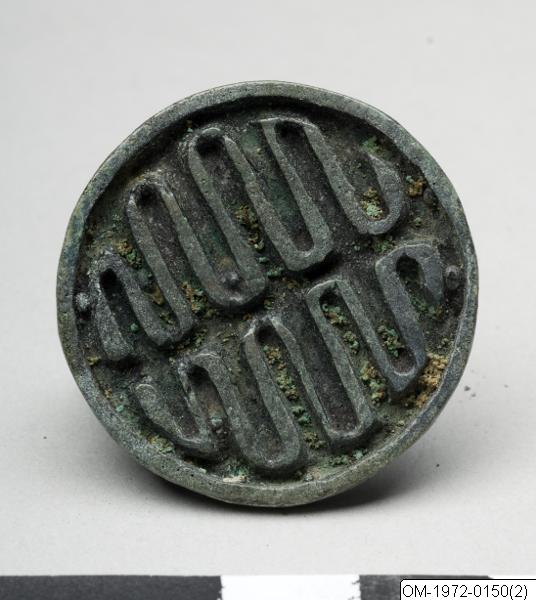Det här sigillets runda bottenplatta har filmärken. En hårt stiliserad djurfigur är placerad på bottenplattans ovansida och fungerar som handtag. Kroppen är platt, frambenen raka och långa och en lång svans böjer sig uppåt längs ryggen. Djurets huvud saknas. Stämpelytan har ett geometriskt mönster av snirklande linjer i relief, liknande dem som finns på sigillen med numren OM-1972-0149 and OM-1972-0150. Inskriften verkar vara gjord av flera olika metallstänger som lötts fast på bottenplattan. Mönstret skulle kunna föreställa en stiliserad form av tecknet龜, ”sköldpadda. Sköldpaddan symboliserar långt livUrsprunget till de koreanska sigillen hittar man i Kina, där man vet att sigill har används åtminstone sedan Handynastin (206 f.Kr – 220 e.Kr). De första koreanska sigillen är från omkring trehundratalet före vår tidräkning. (De tre kungarikenas tid 57 f.Kr – 668 e.Kr). Troligtvis började sigill då användas för att intyga och bestyrka både officiella och personliga dokument, samt målningar och kalligrafier. Det fanns två sorters sigill: officiella sigill som användes av kungar, feodalherrar och statliga verk, samt privata sigill med namn, smeknamn och citat från dikter eller klassiker och som användes ungefär som en signatur. Under Goryeo (918-1392) upprättades och drevs tre efter varandra följande statliga verk med ansvar för officiella sigill. Det finns inga nu kända officiella sigill som överlevt från Goryeo, eftersom den nya statsstyrelsen gjorde sig av med dem när Joseondynastin trädde till makten under det sena trettonhundratalet. Det finns däremot gott om privata sigill från Goryeo. De är vanligtvis i brons och består av en bottenplatta med en graverad stämpelyta och ett handtag som antingen är enkelt eller utsmyckat och som gjorde det möjligt att fästa sigillet vid bältet. Legenderna innefattar kinesiska tecken, men även symboler och geometriska figurer, och är i många fall otydbara. Sigillens legender och dekor är ofta relaterade till ett långt liv och välgång och innefattar även buddistiska symboler. Även om inte mycket är känt om deras funktion så användes de troligtvis till att försegla kuvert och dokument. Den koreanska sigillsamlingen på Östasiatiska museet består av 129 bronssigill och ett stensigill och speglar mångfalden och den hantverksskicklighet med vilken sigill framställdes under Goryeo. Bottenplattornas form varierar och kan vara runda, rektangulära eller åttkantiga. Handtagen består antingen av en enkel ögla på bottenplattan, en stående skiva med ett hål som användes för att fästa ett snöre vid sigillet (huvuddelen av dessa sigill är formade som en ”yeoudi” – en molnformad symbol för välgång) eller formade till avbildande figurer såsom lejon, fiskar, sköldpaddor, människor eller fåglar, även dessa med ett hål eller snörögla. Alla legender är inte i läsbart skick men sigillen kan kategoriseras i följande grupper: personliga sigill, familjesigill, sigill med symboler och stiliserade tecken (till exempel långt liv, rikedom eller hälsa) sigill med bildlegender och sigill med legender som visar sigillets funktion (exempelvis tecknet för ”förseglat” (koreanska: bong)). I många fall är de kinesiska tecknen stiliserade med snirkliga linjer anpassade till sigillplattans form (koreanska: gucheopjeon), men även andra typer av sigillskrift användes. Det är inte mycket vi vet om tillverkningsprocessen, men vanligtvis är de mindre sigillen gjutna i ett stycke medan dess att handtagen på de större sigillen ofta är gjutna för sig och har sedan fästs på bottenplattan. Några av legenderna är formade av flera metallremsor som har lötts fast på sigillets bottenplatta.