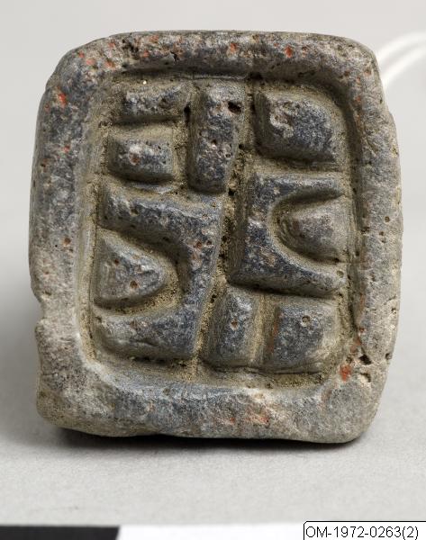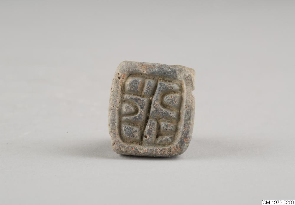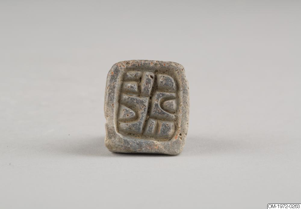 This seal has a thick base which extends into a pyramid-shaped handle. The top of the handle is rounded, and a hole was drilled through the centre to facilitate the fastening of a cord. The bottom of the seal is inscribed with an indecipherable character or pattern in intaglio. Remains of red seal paste can be seen on the surface. The origin of Korean seals can be traced back to China, where seals are known to have been in use since at least the Han Dynasty (206 BCE – 220 CE). The earliest Korean seals date to around the 3rd century CE (Three Kingdoms period 57 BCE – 668 CE), and it is assumed that seals started to be used from that time as a means for certifying and authenticating official and personal documents, as well as paintings and calligraphies. There were two kinds of seals: official seals used by kings, feudal lords and government offices; and private seals with names, sobriquets or excerpts from poems or classics, comparable to a personal signature. In the Goryeo Dynasty (918 – 1392), three consecutive government offices in charge of official seals were established and operated. There are no known official seals surviving from the Goryeo government because they were disposed of when the new Joseon government took over the leadership of the country in the late 14th century. However, private seals of the Goryeo period are still extant in large numbers. They are generally of bronze and consist of a bottom plate with an inscribed stamping surface and a handle that can either be simple or ornate, which allowed them to be fastened to a waist belt. Inscriptions include Chinese characters, but also symbols and geometric patterns, and are in many cases indecipherable. The inscriptions and decoration of the seals are often associated with longevity or good fortune and include Buddhist symbols. Although not much is known about their function, they were probably used for sealing envelops and documents. The Korean seal collection of the Museum of Far Eastern Antiquities includes 129 bronze seals and one stone seal, reflecting the diversity and craftsmanship of Goryeo seals. The shape of the bottom plates varies from circular to rectangular, and octagonal forms. Handle shapes include simple loops on top of the bottom plate, vertical flat handles (the majority shaped in the form of a yeouidu – a cloud-shaped symbol for good fortune) with a hole for a cord and figurative handles in the shapes of lions, fishes, tortoises, humans or birds with a hole or loop for attaching a cord. Not all inscriptions are legible, but they can be categorized into personal seals, family seals, seals with symbols and stylized characters (for example longevity, wealth or health), seals with pictorial inscriptions and seals with an inscription indicating its function (for example the character for “sealed” (Korean: bong)). In many cases, the Chinese characters are written in a stylized form with meandering lines and adapted to fit the shape of the seal plate (Korean: gucheopjeon), but other types of seal script were likewise used. Not much is known about the production process of the seals, but their examination shows that, generally, smaller seals were cast in one piece, while larger seals have separately crafted handles that were attached to the bottom plate. Some of the inscriptions were fashioned out of several metal strips that were soldered onto the bottom plate of the seal.