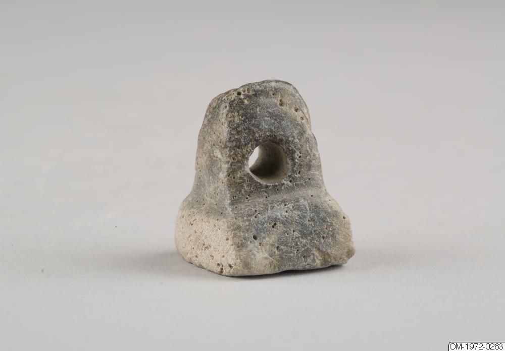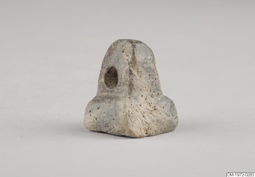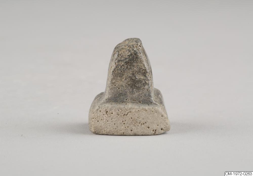 This seal has a thick base which extends into a pyramid-shaped handle. The top of the handle is rounded, and a hole was drilled through the centre to facilitate the fastening of a cord. The bottom of ...