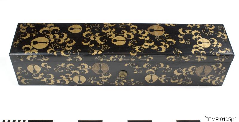 Avlång låda av lackerat trä, från Japan. Locket och lådan är dekorerade med växtslingor i guldlack. Lådan har en insats med på tre ställen genombrutet geometriskt mönster. På utsidans båda långsidor en metallring. Eventuellt OM-1963-0098./PH
