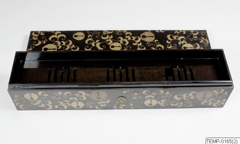 Långsmal låda för målningar. Svart lack med dekor av blomrankor i guld och familjevapen. Lack: teknik och funktion Den japanska lacken kommer från lackträdet (Rhus verniciflua/vernicifera) som är slä...