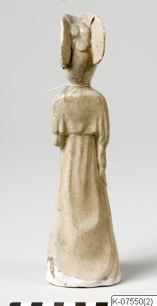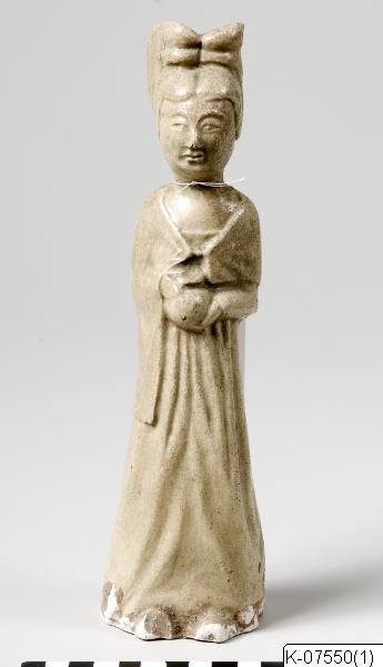 Gravfigurin. Stående kvinna klädd i lång klänning med vida ärmar, hållande en vas i händerna. Ljust lergods täckt med halmfärgad lätt krackelerad glasyr.
