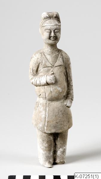 • Gravfigurin. Stående tjänare av ljust lergods med spår av gul glasyr.