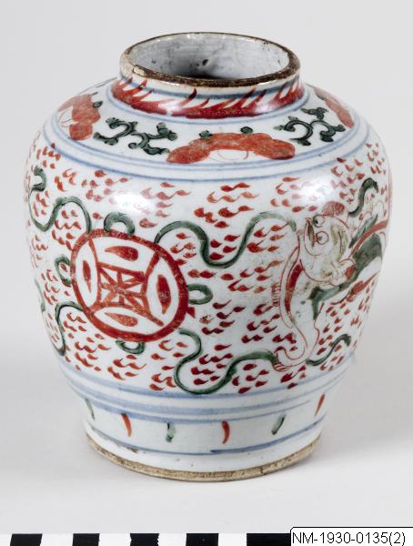 • Kruka av porslin med dekor i gröna och järnröda emaljfäger och underglasyrsblått. Dekoren föreställer dekorativa band, växtlighet och bl.a. två hundar (?) med bakomliggande moln. Krukan har en låg kant och är lätt äggformig, med en bukning upptill. Oglaserad fot / sokel. Mynnign med kort hals. Sen ming, 1600-tal. Kina. Höjd 45 cm.