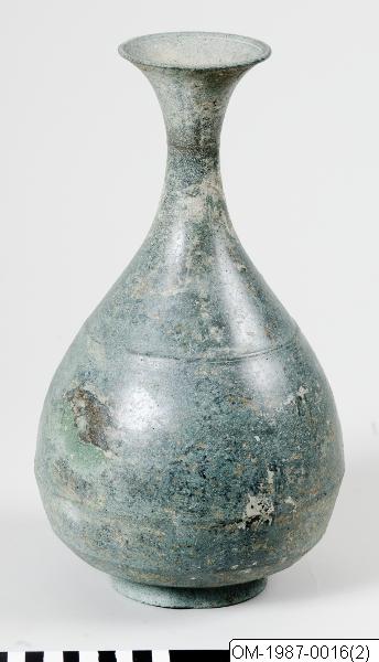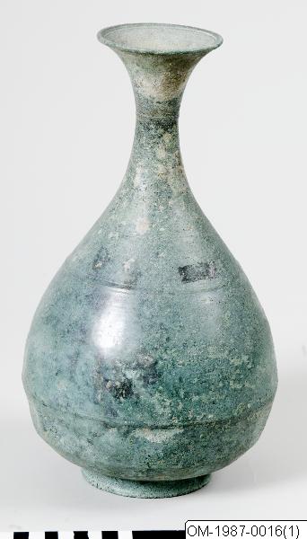 This bronze bottle has a flaring mouth and a pear-shaped bottom-heavy body on a foot. A series of raised and incised lines encircle the whole vessel from the neck to the bottom. Incised lines can also be seen on the interior surface of the mouth. On one side, there is a patch that was mended during the production. The bottle was probably turned on a lathe, in several pieces, and soldered together. The joint lines were covered with decorative lines. The foot and base were made separately and attached, probably soldered, to the body of the vessel. The bottle is almost entirely covered in a bluish-green patina. Bottles of this shape were produced in metal and ceramics. The metal version is assumed to have been used in Buddhist rituals for holding and pouring water or as wine or water bottles in households of the Goryeo elite (Goryeo dynasty: 918-1392).