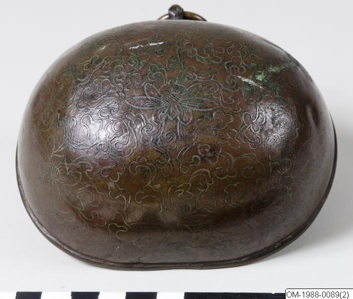 • Den här bronsskålen påminner till sin form om en halv kalebass. Den har en utsvängd kant och sidorna går i en jämn båge ner till den runda basen. På ena sidan sitter en ring fast i kärlet med en nit och två blomformade brickor. Den ena brickan sitter mellan ringen och koppens vägg och den andra på koppens insida. Koppens utsida är dekorerad med sju lotusblommor: sex av dem ringar in den sjunde som... Visa hela
