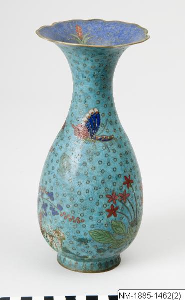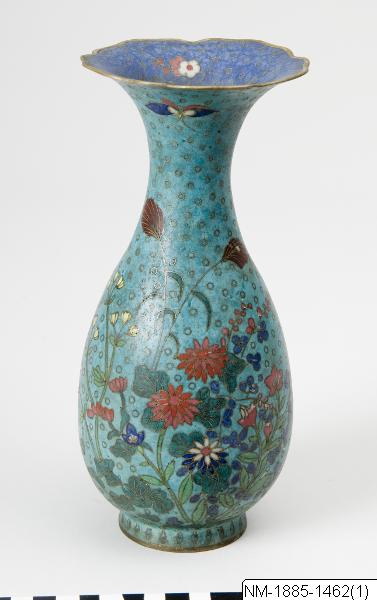 • Vas i emalj på koppar. Flaskform med vid mynning. Prydd med blommor och fjärilar i färger mot grön-blå botten. 1800-tal, Japan.