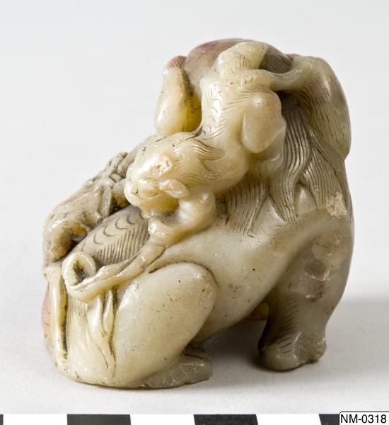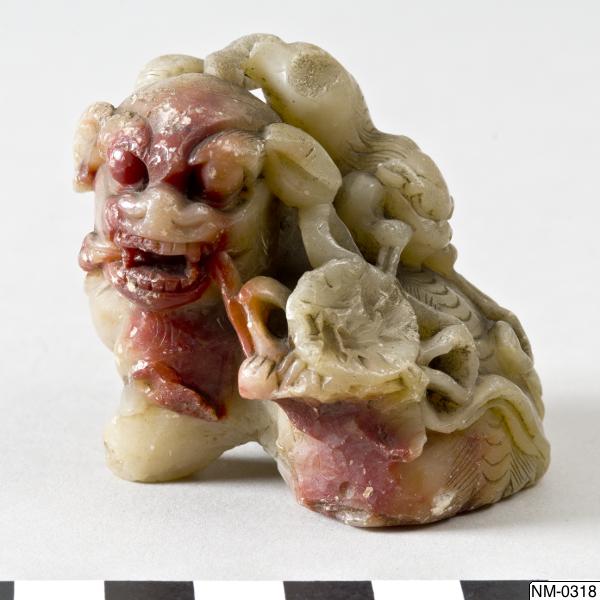 • Liten skulptur i rödfläckig agat (jade?). Föreställande ett sittande lejon (hona?). På lejonets rygg en lejongunge med en girlang. Kinesiskt arbete.
