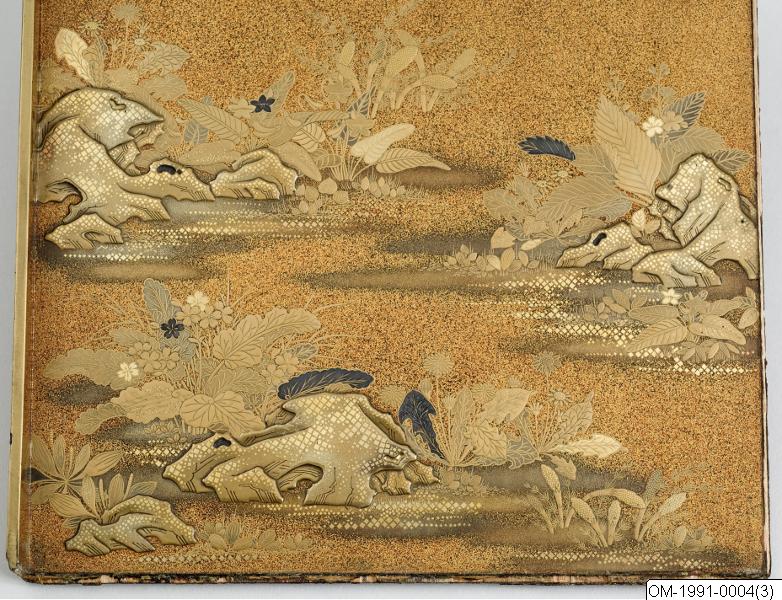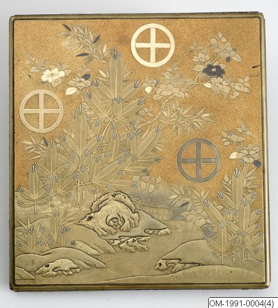 Skrivask (suzuribako) av lackerat trä, från Japan. Skrivasken består av en ask med två insatslådor; en med en vattendroppare i silver samt en rivsten, en tom. Askens utsida är dekorerad i guldlack med kors i cirklar (Shimazu-familjens familjevapen) och tallskott. Insidan har nashiji-lack med guldlack på de två insatslådorna. Lockets insida har dekor i guld av små klippor och vårblommor. Två av lockets kanter är trasiga och förvaras löst tillsammans med asken. Gåva av Ralph Herrmanns.