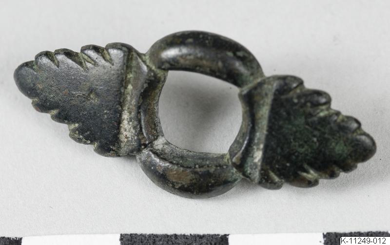 • Beslag. På baksidan rester av två avbrutna öglor. Mörkgrön patina.