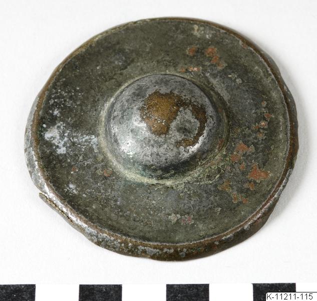 • Runt beslag, med välvt upphöjning i mitten. Silver?