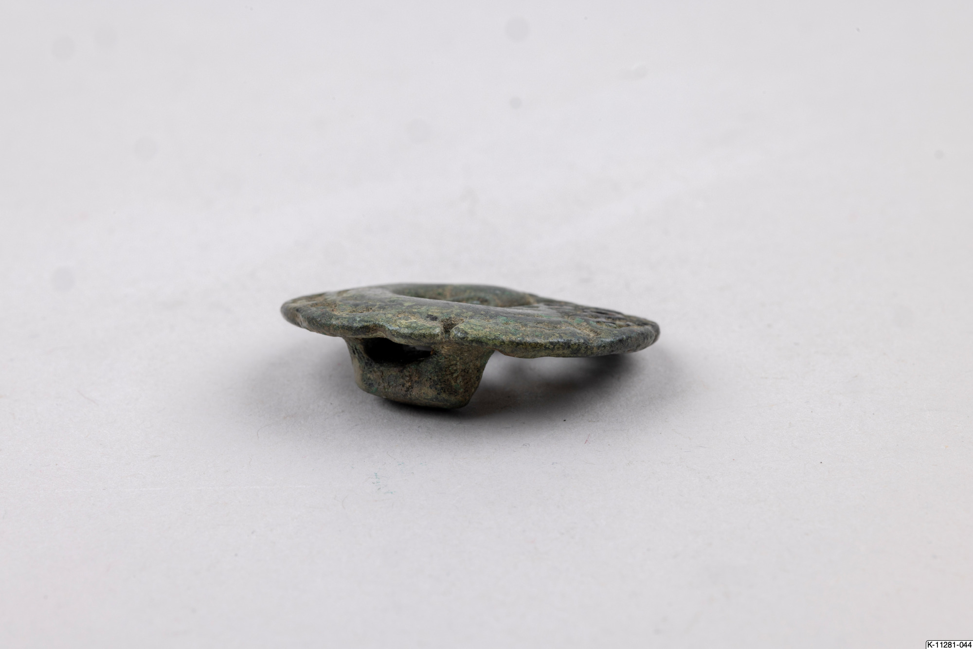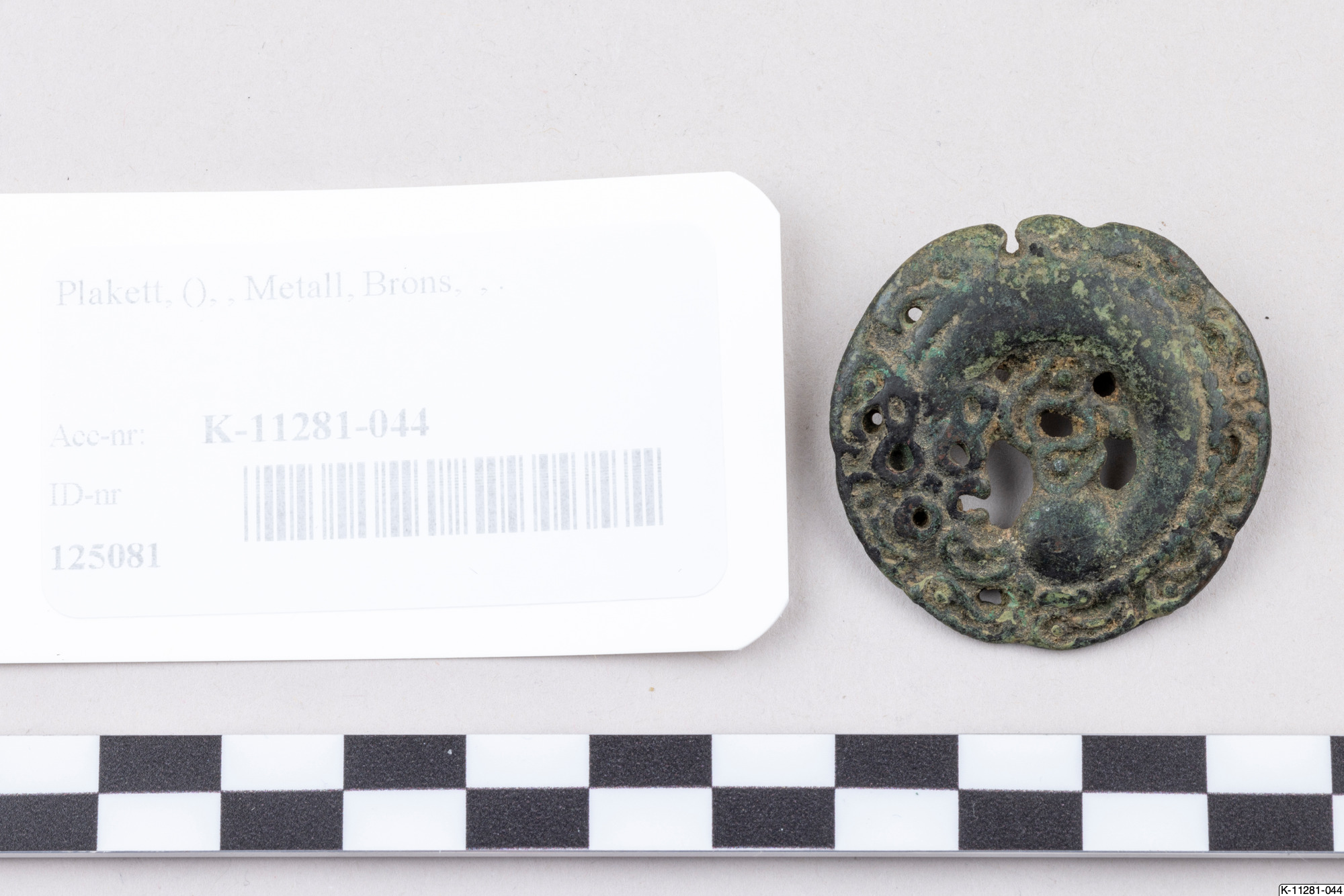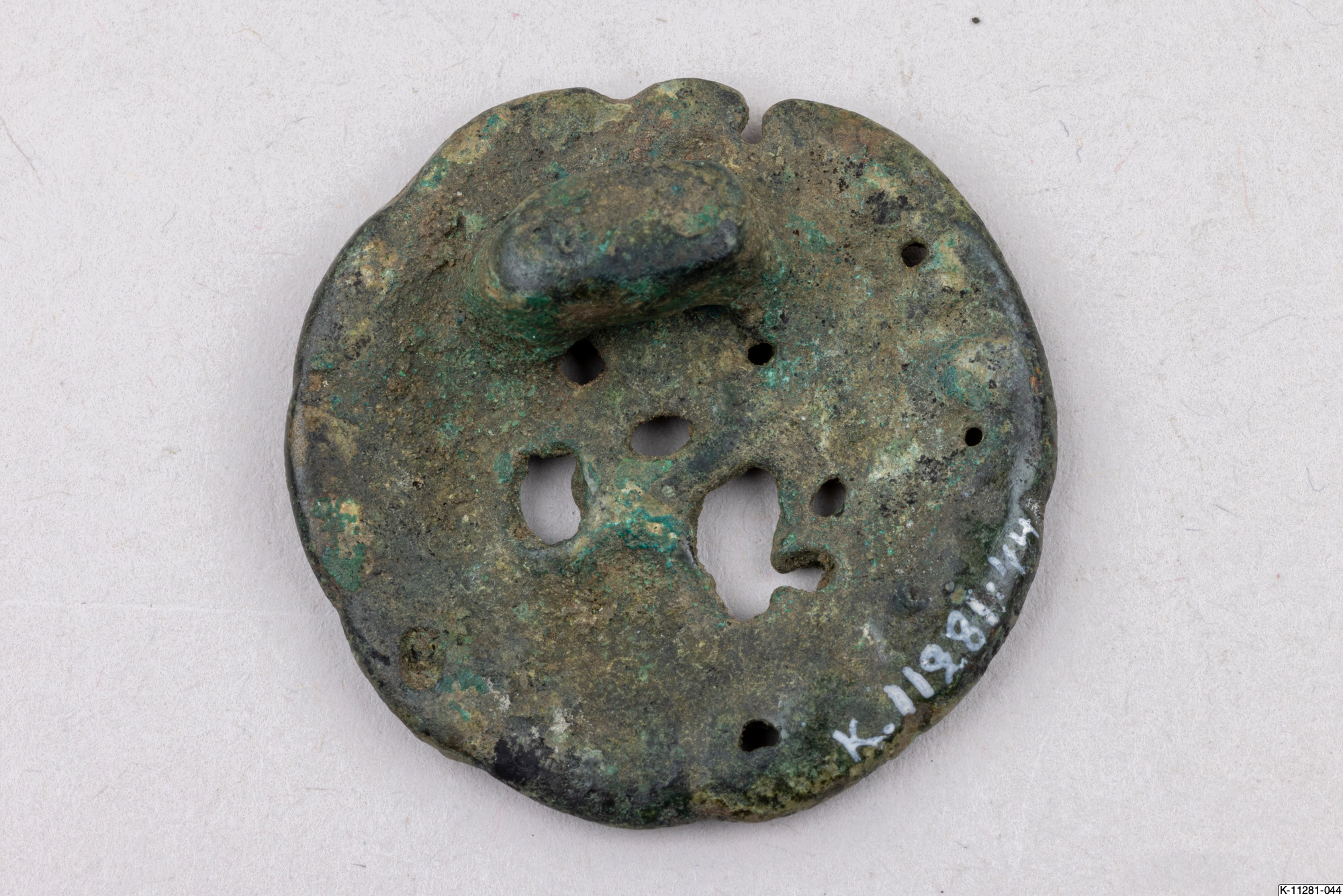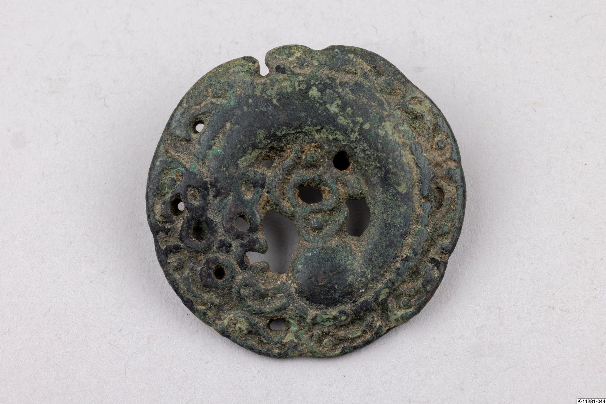 • Plakett med hoprullat djur omgivet av fågelhuvud. Märla på baksidan.